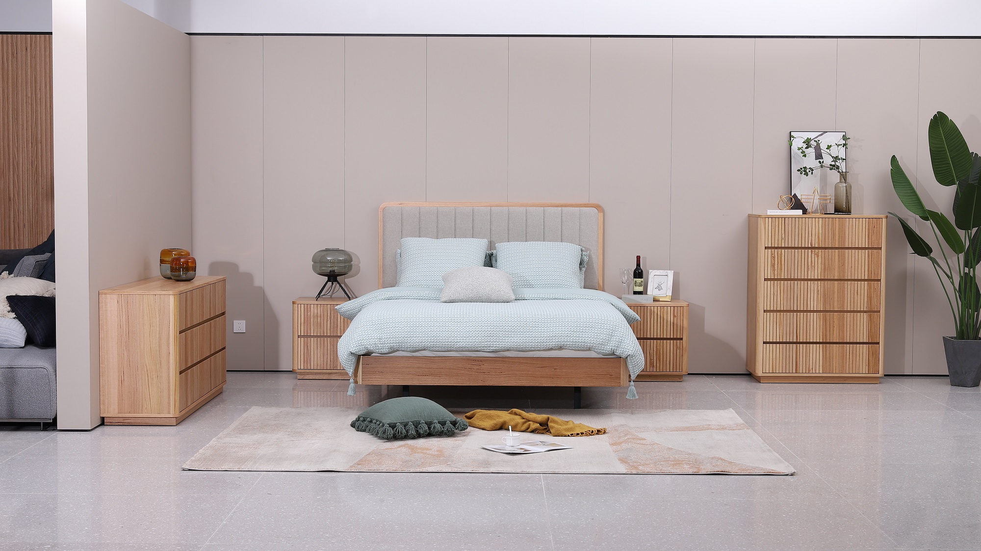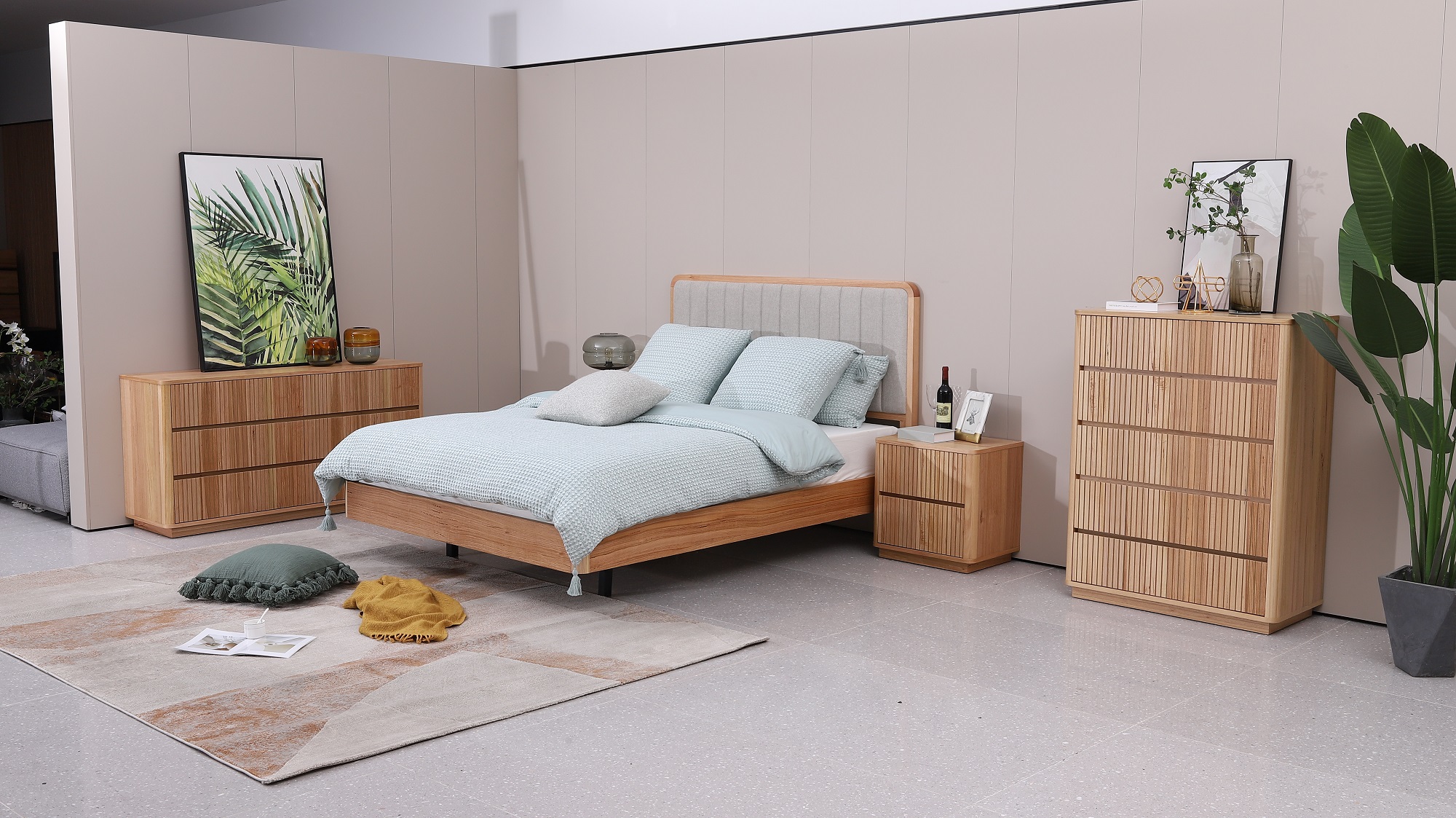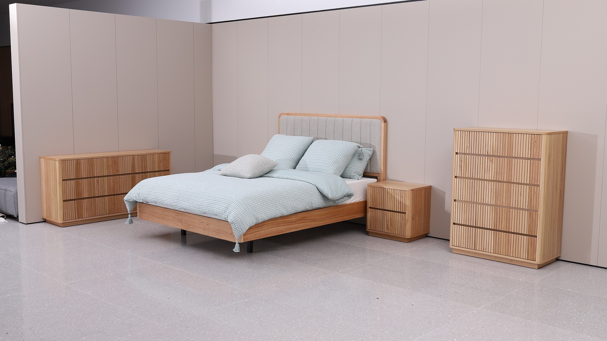 The Urban bed is modern and stylish, featuring an upholstered light grey bedhead with horizontal panels. This contemporary and sleek design along with floating bed base adds character and style to your bedroom. You can buy the Urban bed on its own of purchase it in a 4 Piece Package Suite which includes a Queen or King bed, two Bedside Tables and a Tallboy. There is an option to upgrade to a Dresser suite for an additional charge. The case goods all feature a sleek modern panel design